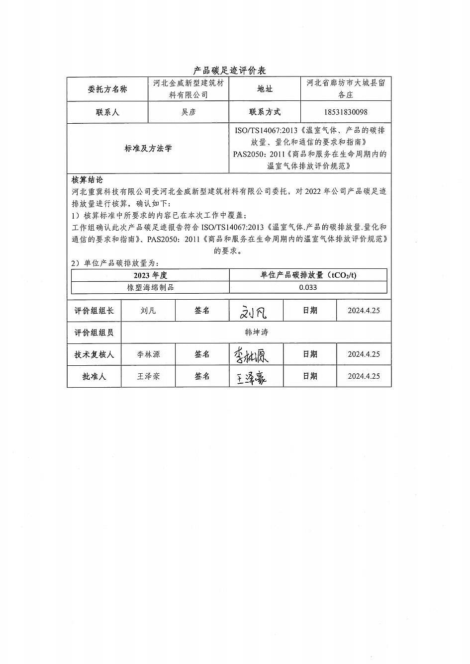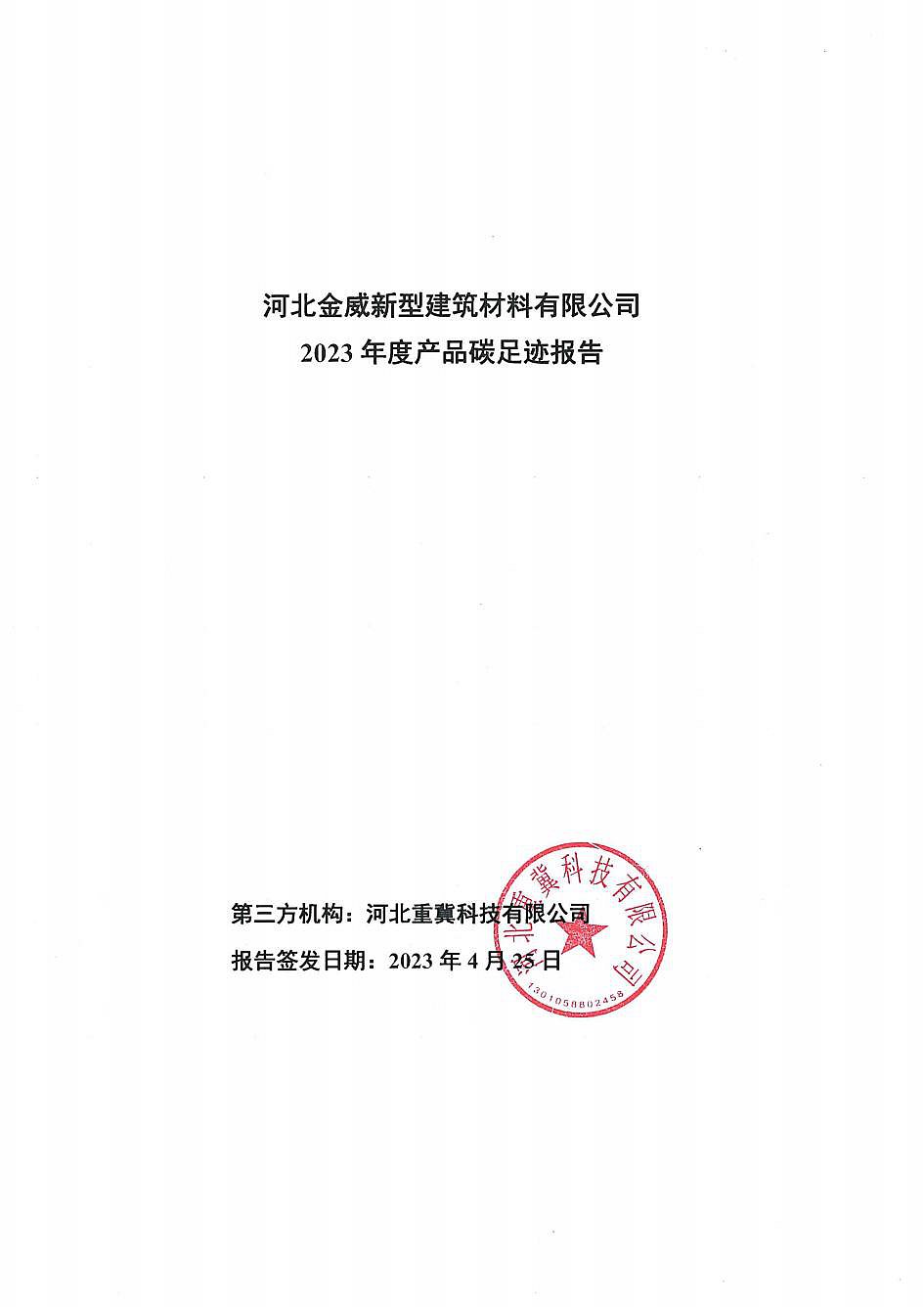 河北金威新型建筑材料有限公司2023年度產(chǎn)品碳足跡報(bào)告