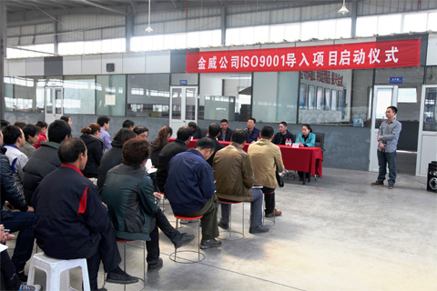 2013年4月15日金威公司ISO9001啟動(dòng)儀式在金威生產(chǎn)廠區(qū)正式舉行。總經(jīng)理高永濤先生、公司中、高層管理人員、高級認(rèn)證專家文遠(yuǎn)老師及各部門員工參加了此次啟動(dòng)儀式。